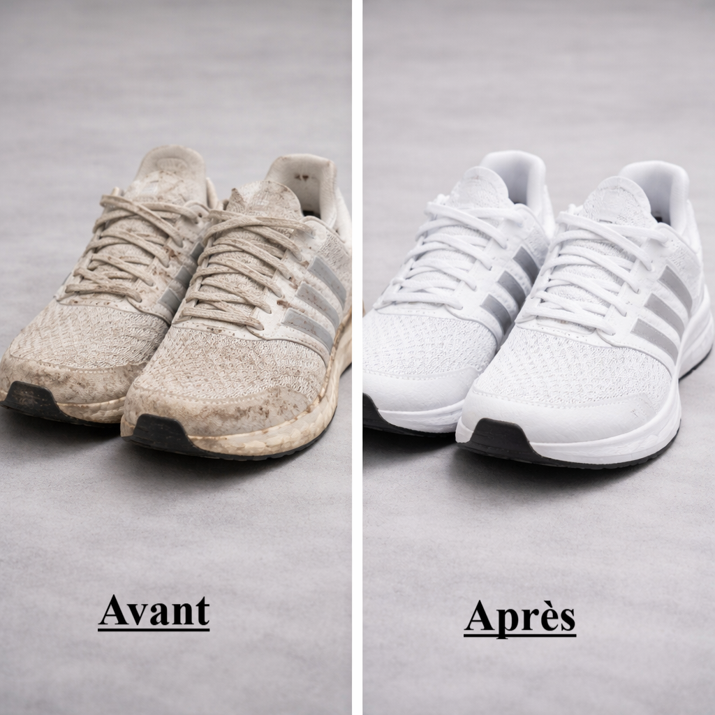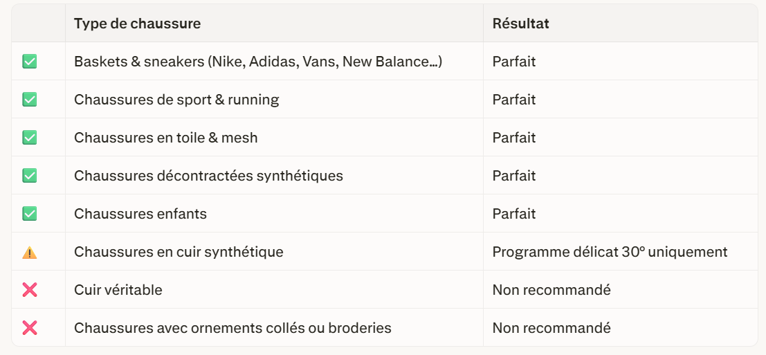 ✔️Baskets et sneakers (Nike, Adidas, Vans, New Balance…) ✔️Chaussures de sport et running ✔️Chaussures en toile, mesh ou synthétique ✔️Chaussures enfants ❌Non recommandé pour le cuir véritable ou les chaussures avec ornements collés